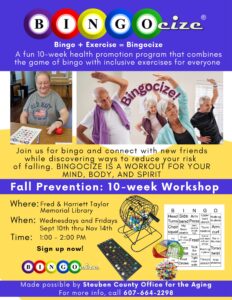 FreeFun & Healthy Bingo from the Steuben County Office for the Aging. Bingocizers play two 45-60 minute games per week for 10 weeks. Games consist of exercises designed to improve all functional fitness including range of motion, balance, muscle strength & cardio-respiratory endurance. Sign up now or stop by. Result: it’s fun & healthy!