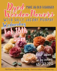FreeJoin Sally Jacoby Murphy to learn how to make your own dyed wooden flowers. Materials will be provided but class size is limited to 10. Please RSVP below or call the library to hold a place.