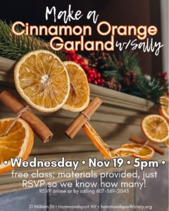 FreeJust in time for the holidays: join Sally Jacoby Murphy downstairs at the library from 5-6pm to create a beautiful cinnamon stick & orange garland. Free class; materials provided. Please RSVP here or by calling the library at 607-569-2045 so we can prepare the correct amount of supplies. Thanks!