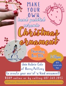 FreeJoin Aubrie Cole of Hammondsport’s Berry Pottery for a class hand-painting your own one-of-a-kind Christmas Ornament on Thursday, Dec 11th at 5:30pm. There is a $15 materials fee for this class, due at arrival. Please RSVP so that Aubrie can prepare the materials. You can RSVP here or by calling 607.569.2045