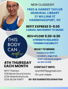 Lynn will hold two sessions from 5-6:30pm on the last Thursday of each month beginning Thursday, Jan 29th. The first session, from 5-5:30pm is called REFIT: cardio movement to music. The second session is 5:30-6:30pm and is called REV+FLO: strength, balance, toning & flexibility development.