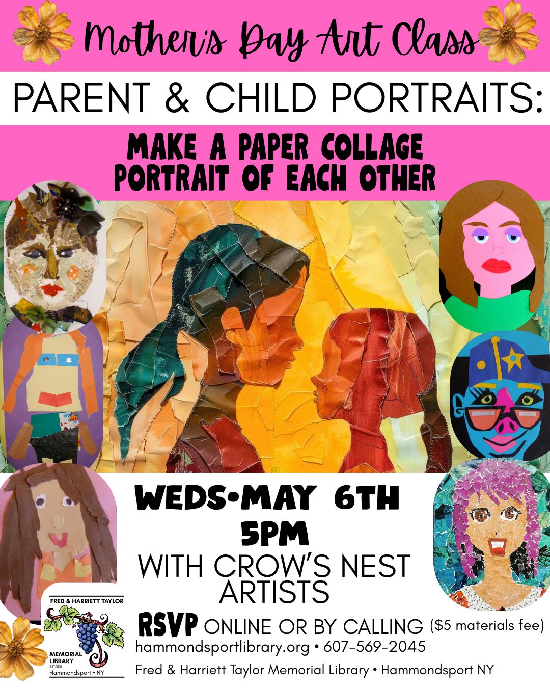 poster for an art class on Weds May 6th at 5pm with Crow's Nest Artists: making torn paper collage portraits, Parents & children will make portraits of each other.