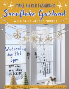 FreeMake an old-fashioned snowflake garland with Sally Jacoby Murphy on Wednesday, Jan 21st at 5pm, downstairs at the library. Materials will be provided; free and open to all. Please RSVP below or by calling the library at 607.569.2045 so we can gauge materials needed.