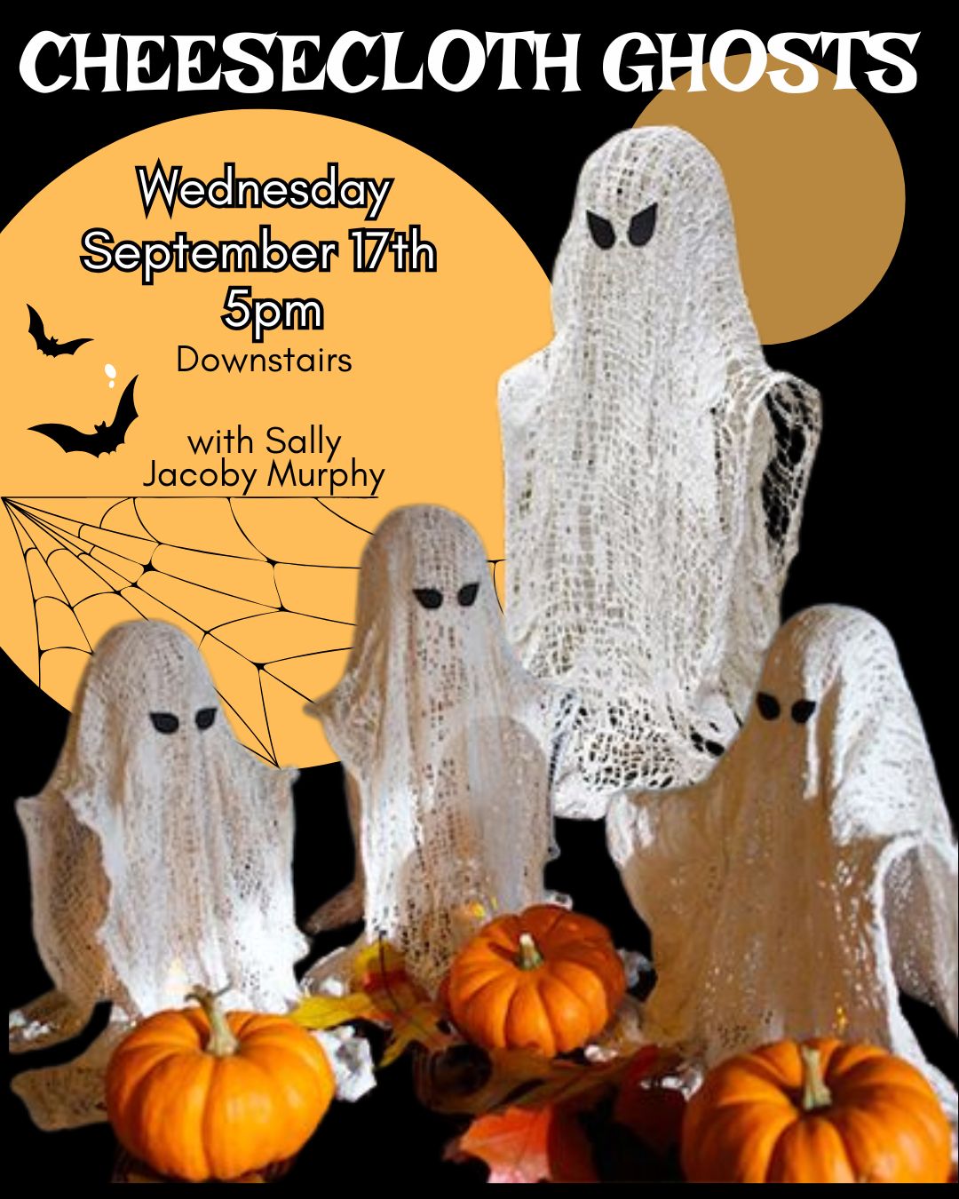 FreeJoin Sally Jacoby Murphy on Wednesday, September 17th at 5pm to learn how to make Cheesecloth Ghosts. Materials will be provided, class is free.