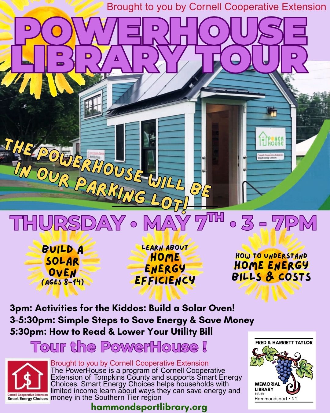 Join us on Thursday, May 7th for a visit (in our parking lot!) from Corning Cooperative Extension’s tiny PowerHouse! This mobile Tiny House is an example of Clean Energy housing so that the CCE can use hands-on displays to teach about home energy & efficiencies. CCE will also hold a session on understanding home energy bills & costs all the while helping the kiddos build a Solar Oven right in our parking lot! (Solar oven building is targeted for the 8-12 YO age group but all are welcome).