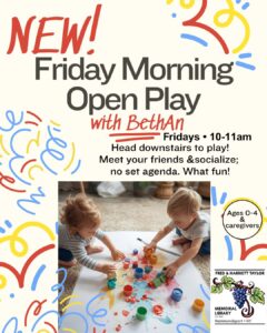 Friday Morning Open Play! Just like it sounds, BethAn will have the storytime area downstairs open for you to come & play. No structure, no agenda. Friday Morning Open Play is a time to play with your friends & make new friends too. Intended for ages 0-4 and their caregivers, of course all are welcome.