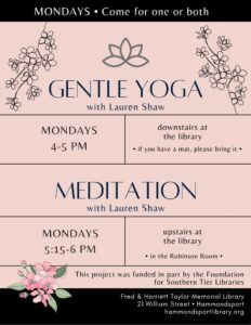 Join Lauren Shaw in a Gentle Yoga class Mondays from 4-5pm, downstairs at the Library.