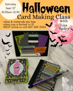 FreeJoin Lisa Bailey to create some spooky Halloween cards just in time to pop in the mail. Lisa will provide some beautiful papers and equipment to create some great cards. This class is free and is limited to 10 participants. You can RSVP below or call the library at 607-569-2045.