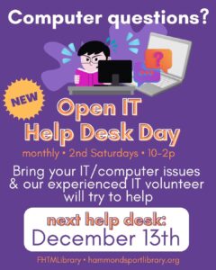 Have computer issues or questions? Don’t be shy; come over to see our experienced IT Help Desk staff, Kayla Williams, the second Saturday of each month. Bring your device & let Kayla help you! All day Saturday from 10am – 2pm. Open to all; free service.