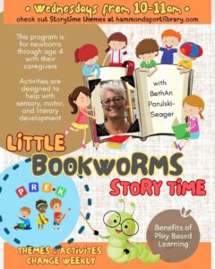 Little Bookworms is for ages 0-4 and their caregivers. BethAn Parulski-Seager develops & implements each Storytime. BethAn’s 20 years of educational experience offers a wide range of learning events for your Little Bookworm.