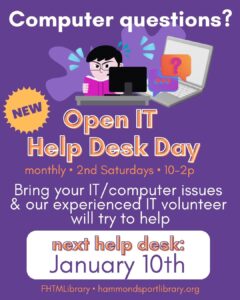Have computer issues or questions? Don’t be shy; come over to see our experienced IT Help Desk staff, Kayla Mills, the second Saturday of each month.  Bring your device & let Kayla help you!  All day Saturday from 10am – 2pm. Open to all; free service.