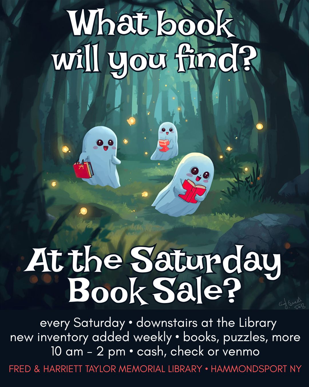 Our ‘Book Ends’ Book Sale Rooms are Open 10-2 every Saturday, downstairs at the library.