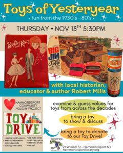 As part of the library’s November Toy Drive for local Hammondsport kiddos, Robert asks that you bring a new, unwrapped toy, art supplies or game if you are able to donate. Thank you!