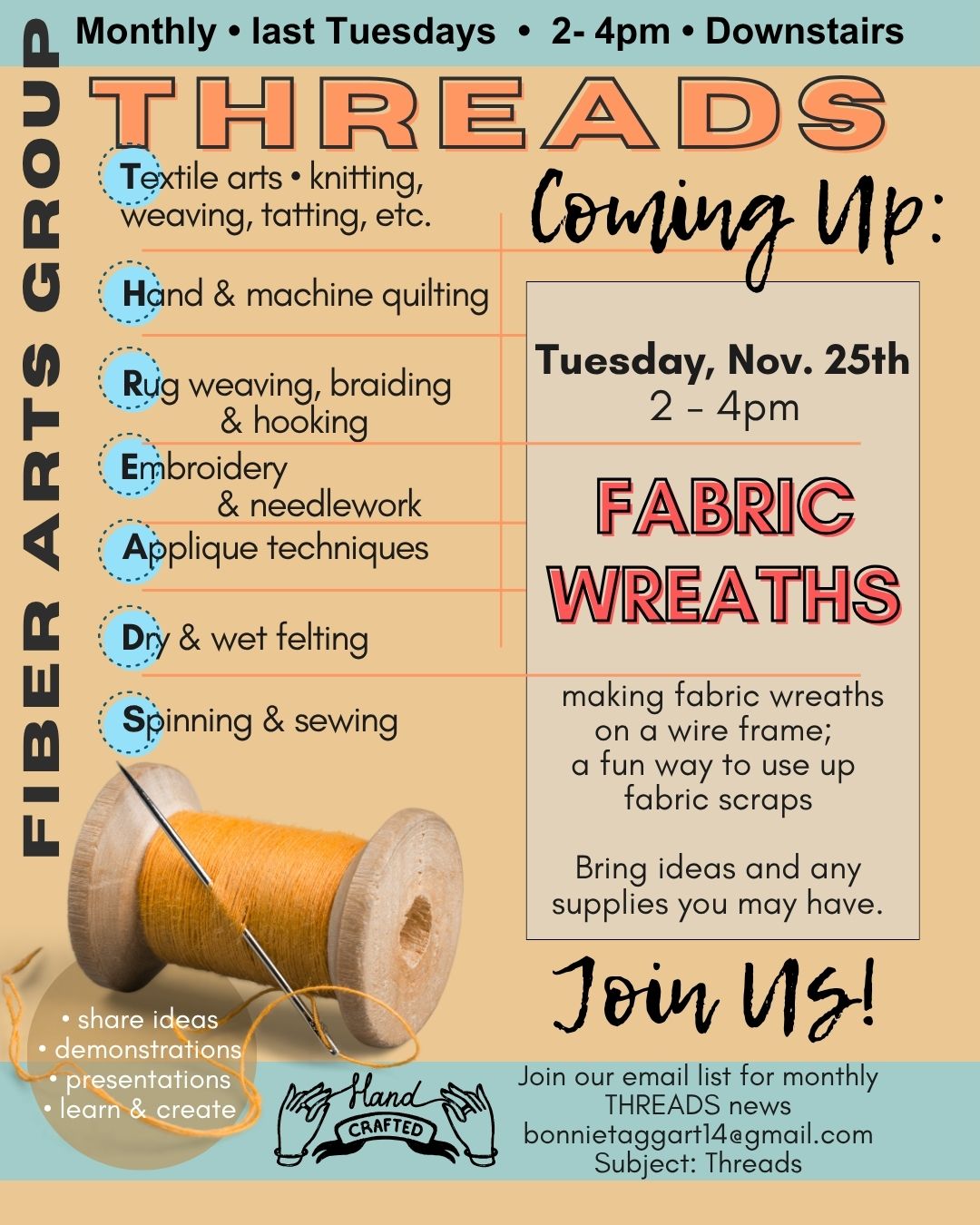 THREADS has an open gathering monthly at the library on the last Tuesday of each month (with the exception of July & August) from 2-4pm. We invite anyone interested in any of the fiber arts to join in, bring your work or just come to see what’s going on.