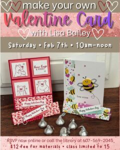 Join Lisa Bailey to make your own Valentine Day cards!  Lisa will provide all of the materials that you’ll need to make your Sweetie something special.